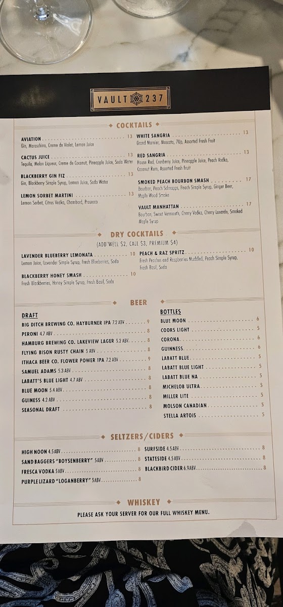 Located at 237 Main St, Buffalo, NY, Vault@237 offers a unique dining experience with a posh prohibition theme that merges elegance with comfort. The menu features a delightful array of dishes that leave a lasting impression.